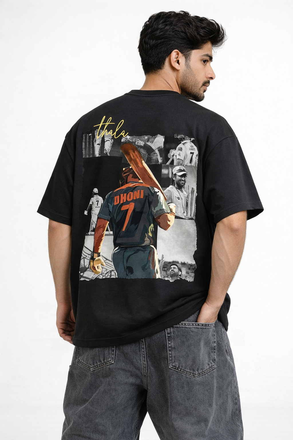 The bold collage design captures memorable moments from Dhoni’s cricket journey, making this T-shirt a must-have for every fan who admires the legacy of “Thala”. Perfect for casual wear, cricket matches, or everyday street style.